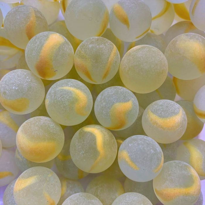 Eine transparente Murmel mit einem gelben Fleck. Die Murmeln haben eine matte Oberfläche.