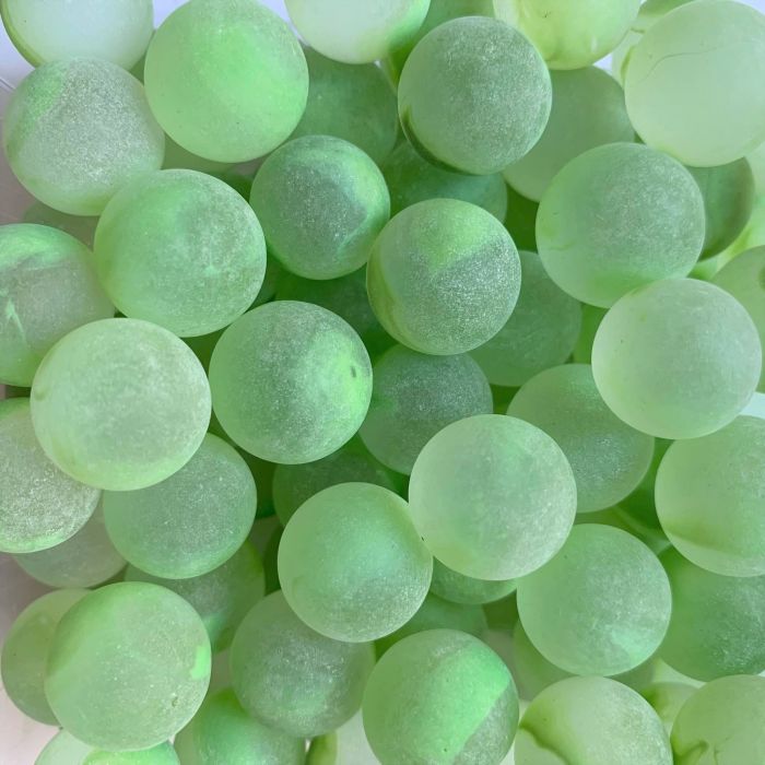Eine transparente Murmel mit einem grünen Fleck. Die Murmeln haben eine matte Oberfläche.