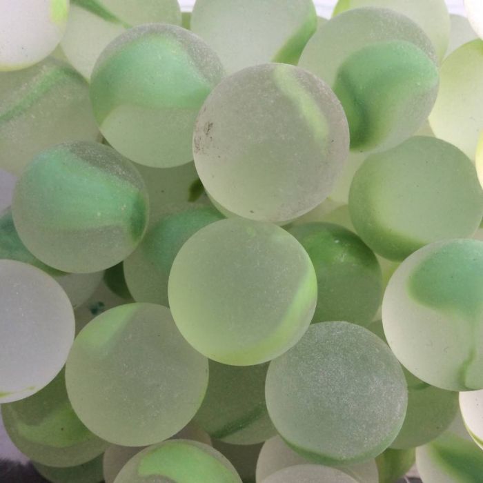 Eine transparente Murmel mit einem grünen Fleck. Die Murmeln haben eine matte Oberfläche.