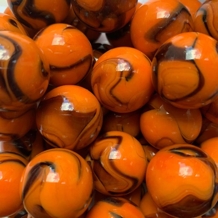 Undurchsichtige, orangefarbene Murmel mit schwarzen Schlieren an der Oberfläche.