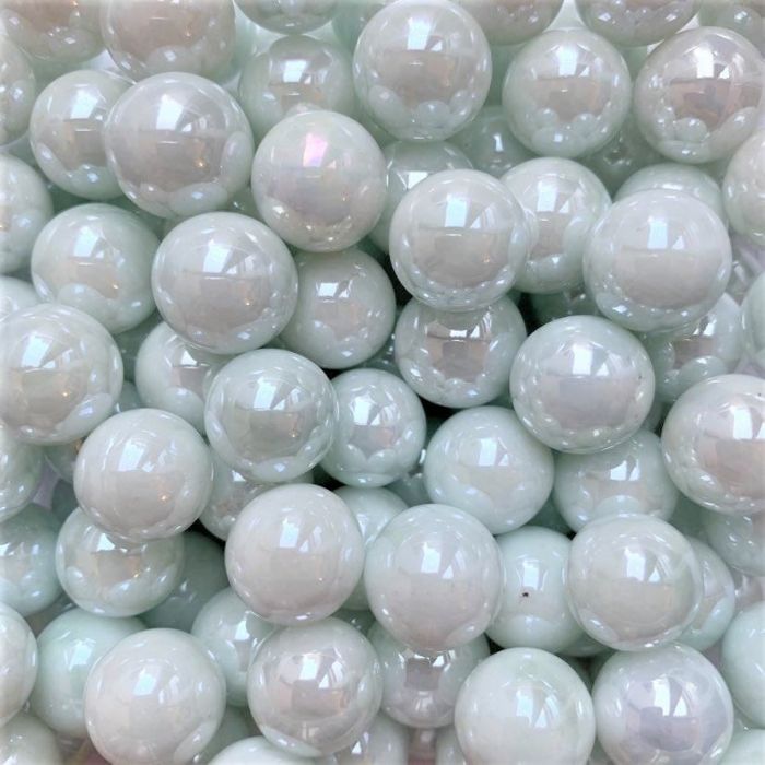 Undurchsichtige, weiße Murmel mit Perlmuttglanz-Effekt.