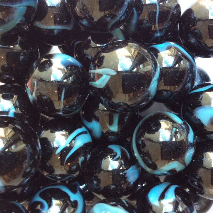 Undurchsichtige, schwarze Murmel mit blauen Streifen.