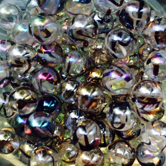 Transparente Murmel mit weißen und schwarzen Schlieren durchzogen.