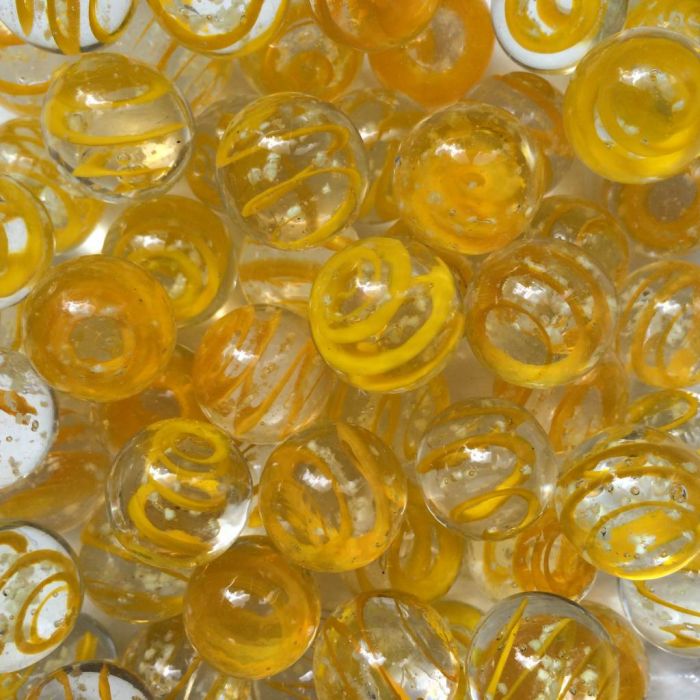 Diese handgefertigte, transparente Murmel hat einen farbigen Wirbel und Punkte im Kern, die im Dunkeln leuchten.