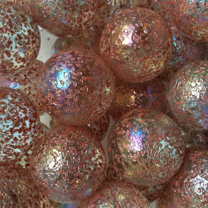 Nach der Herstellung der Murmel wird die Oberfläche erneut erhitzt und durch rosa Glaskrümelchen gerollt. Die Murmel erhält dadurch ein unebenes Aussehen.