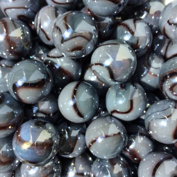 Nicht durchscheinende, silber-graue Glasmurmel mit schwarzen Streifen. Diese Murmeln haben einen schönen Perlmuttglanz.